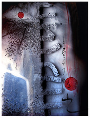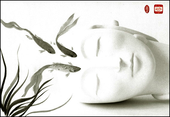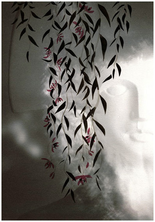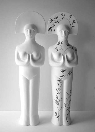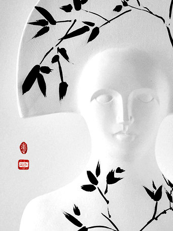 ceramic 65cm high Moved by Lady Li, I cast shadows on my paintings and sculptures using an overhead projector, and paint the designs onto the works. I also photograph shadows on walls and objects, and overlay these onto the images. Each painting has a goddess in mind, and originates in a black and white photograph of a sculpture, some of which can be seen on this page and on my website under Goddesses or Mythological Females. The photograph of the sculpture is first printed onto watercolour or rice paper, and using traditional Chinese and Japanese brush painting techniques, I embellish each sculpture with a painting. |