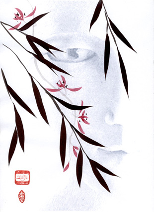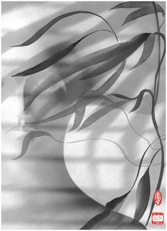 The Chinese Legend of Lady Li One night, in the tenth century, AD, Lady Li sat by her moonlit window, brush in hand, practising her calligraphy. The wind rustled the bamboo leaves outside her window; the full moon shone through, casting a delicate shadow on her rice paper screen by her table. Awakened by the rustle and the cool luminescence of the moon, she noticed the fragile beauty of the bamboo pattern on her screen. Raising her ink-filled brush, she traced the shadow onto the luminous surface. Chinese ink painting was born. Whether myth or history, Lady Li is acknowledged as the inventor of Chinese ink painting. I find it bemusing that the origin of an art form usually restricted to men is attributed to a woman. |
